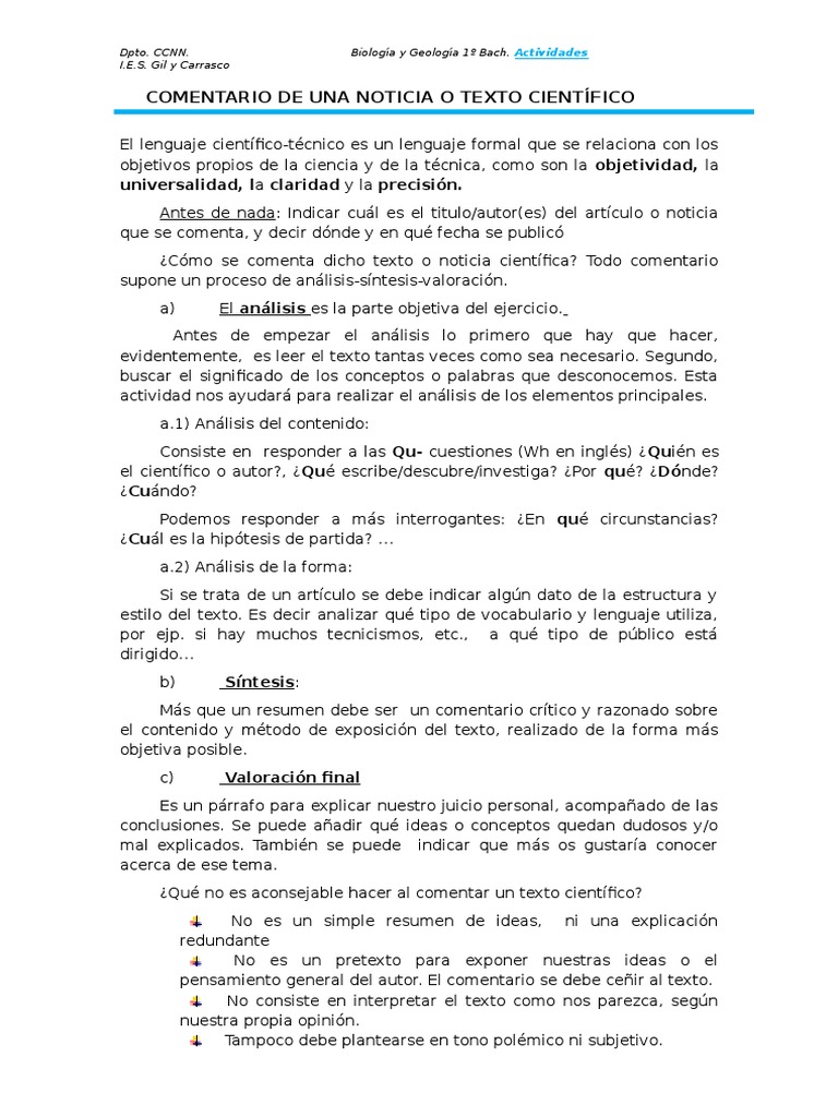 Ante todo, debe quedar claro que, en sentido estricto, el comentario de textos es un método científico de investigación e interpretación, especialmente propio de las disciplinas sociales o humanísticas. Pero ese no es el sentido que hemos Um texto científico se distingue por utilizar linguagem técnica ao expor qualquer tema; Conhece todas as suas características. Comentario de un texto científico texto el ojo no es un analizador armónico, es decir, no es capaz de distinguir cuáles son las radiaciones monocromáticas que constituyen un haz de luz que converge impresionando un elemento de su retina. Así, una luz que llamamos blanca puede estar constituida por infinidad de Hacer un comentario de texto es uno de los ejercicios más repetidos por los estudiantes, opositores o pruebas para universidades (es una de las pruebas previas al acceso a la universidad). Debemos practicarlos con frecuencia y de manera adecuada al igual que otros tests psicotécnicos si se quiere tener éxito en cualquier prueba de acceso. El comentario debe realizar una discusión que realice una aportación nueva reforzando o contradiciendo la discusión original desde una posición crítica con los resultados o con el método.