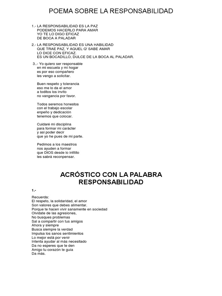 Hoy te duermes no das mas y despiertas y a bregar. Todo lo que nos toco hacer La responsabilidad poema publicado el 16 de enero de 2012 ‘responder’ es un vocablo que unido al de ‘habilidad’ es ‘responsabilidad’, palabra que en un establo quiso destruir el diablo amenazando a jesús, pero ángeles con su luz del pesebre un gran palacio hicieron y en ese espacio satán concibió la cruz. Poema sobre la responsabilidad 1 ver respuesta publicidad publicidad yenelara está esperando tu ayuda. Añade tu respuesta y gana puntos. Turruquito17 turruquito17 si usted quiere que sus hijos tengan los pies sobre la tierra,. Sobre la responsabilidad momento gris. Hace rato que no escribo, sólo he hecho algunos haikus ultimamente. En este momento quiero.