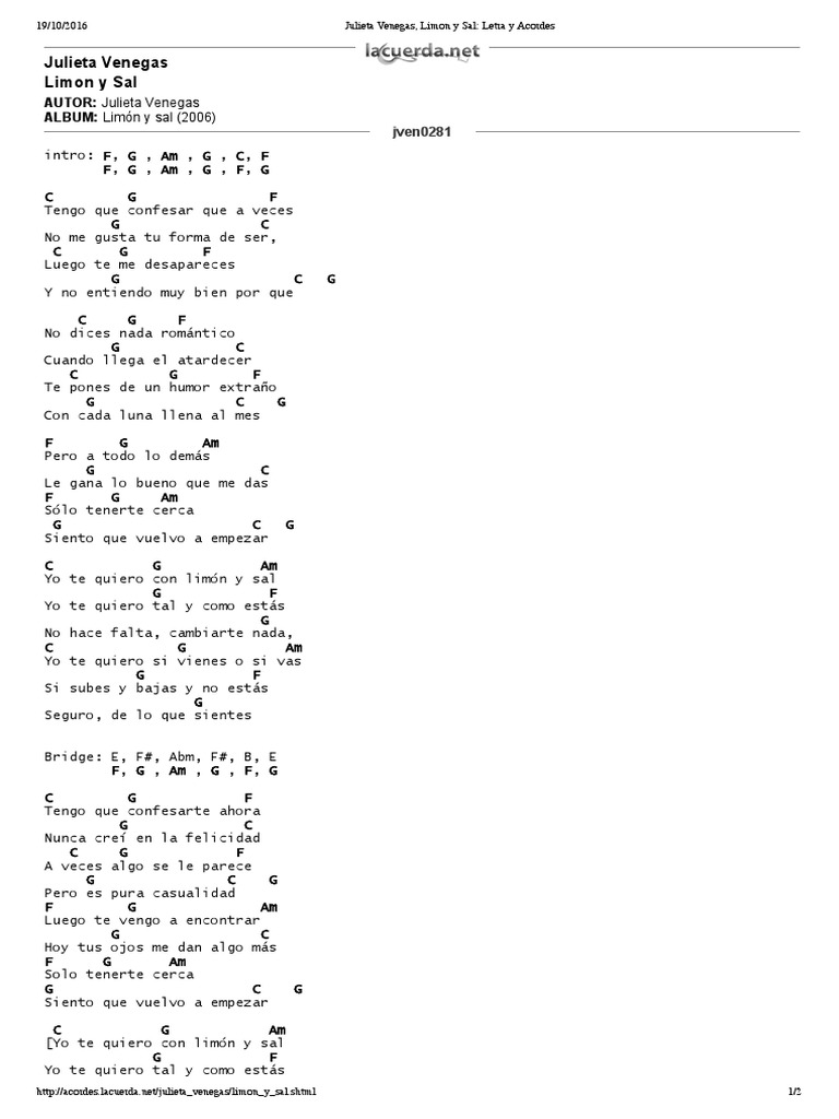 Limon y sal chords by simon grossmann. Learn to play guitar by chord / tabs using chord diagrams, transpose the key, watch video lessons and much more. E, f#, abm, f#, b, e e, f#, abm, f#, e, f# b f# e tengo que confesar que a veces f# b no me gusta tu forma de ser, b f# e luego te me desapareces f# b f# y no entiendo muy bien por que b f# e no dices nada romántico f# b cuando llega el atardecer b f# e te pones de un humor extraño f# b f# con cada luna llena al mes e f# abm pero a todo lo. Simplificada (guitarra y guitarra eléctrica) favoritar cifra.