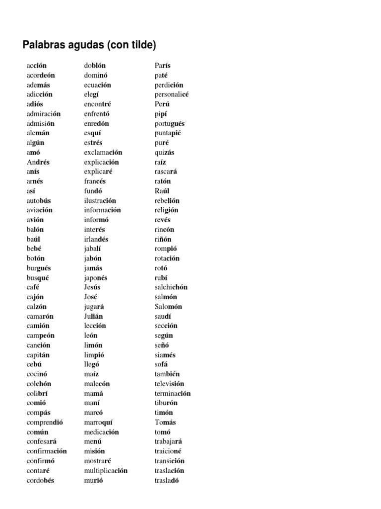 Ver 20 ejemplos de palabras agudas con tilde popular