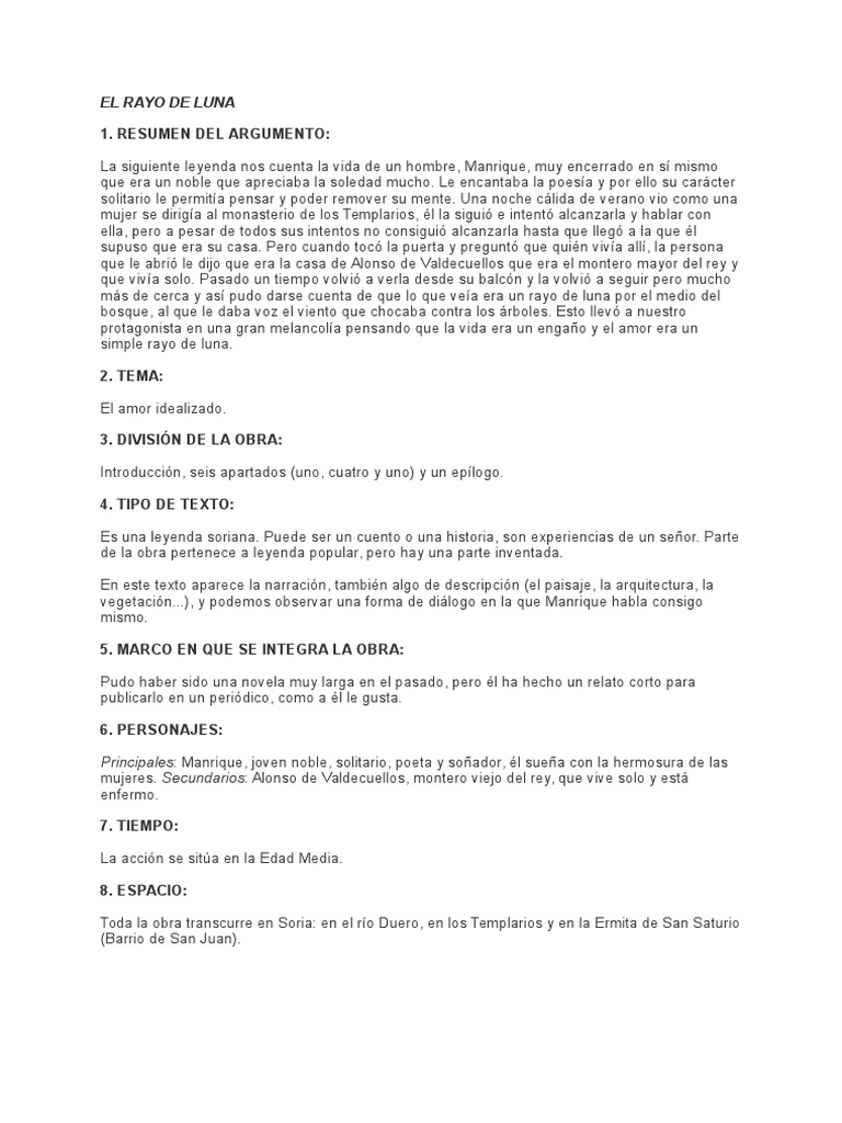 El rayo de luna (el contemporáneo, 12 y 13 de febrero de1862) 1. La siguiente leyenda nos cuenta la vida de un hombre, manrique, muy encerrado en sí mismo que era un noble que apreciaba la soledad mucho. Le encantaba la poesía y por ello su carácter solitario le permitía pensar y poder remover su mente. Resumen de el rayo de luna el rayo de luna presenta a su protagonista, manrique, un joven noble, muy soñador, que gustaba de escribir poesía y se encontraba cautivado por la soledad.