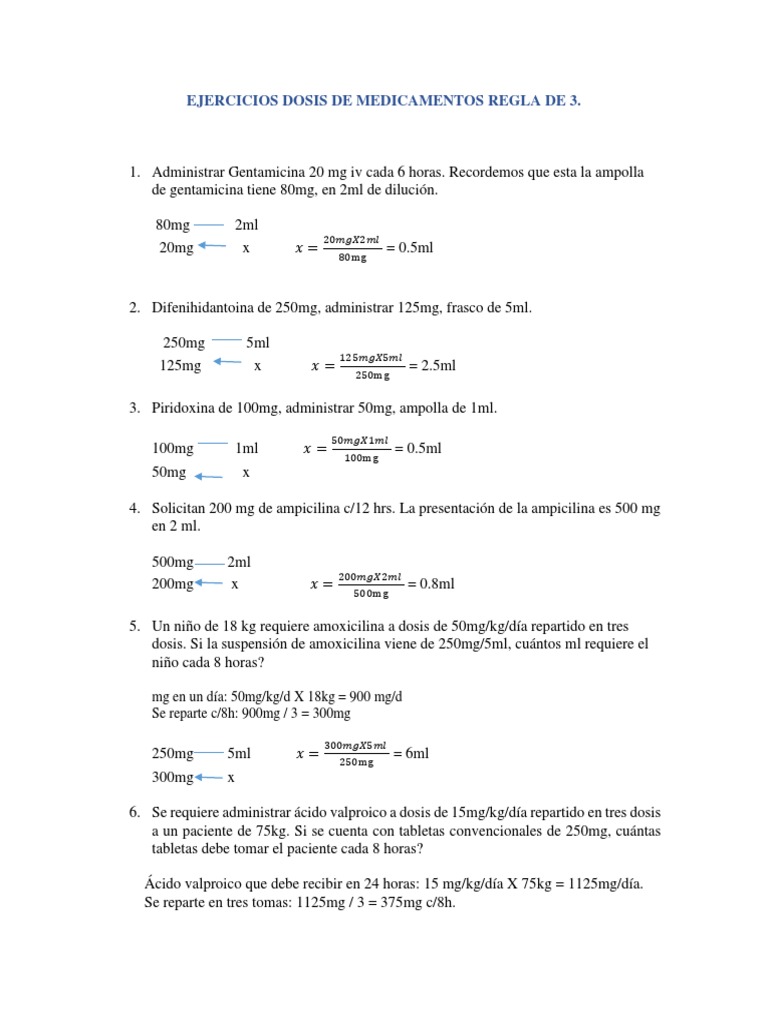Como en cualquier regla de tres necesitaremos contar con tres magnitudes y una incógnita, los cuales se deben organizar de la siguiente forma: A = es el contenido del fármaco. B = la dilución del fármaco. Para poder realizar esta dosificación se te sugiere emplear dos formulas, una basada en un regla de tres y la otra regla basada en la dilución. La regla de tres es el procedimiento que se realiza para obtener la dosificación indicada en forma exacta, aún en cantidades muy pequeñas y así evitar reacciones adversas por concentración del fármaco. Ejemplo 1 regla de tres para medicamentos una niña de 20 kilogramos requiere amoxicilina a dosis de 50 mg/kg/día repartido en tres dosis. Sabemos que la suspensión de amoxicilina viene de 250mg/5ml, necesitamos saber cuántos ml requiere la niña cada 8 horas. Cálculo de dosis en pediatría para médicos y enfermeras con su respectiva regla de 3 aprende a calcular dosis pediátricas de manera fácil y rápida 💯. La denominación común internacional (dci) es una forma de identificar cada medicamento de un modo específico y universal.