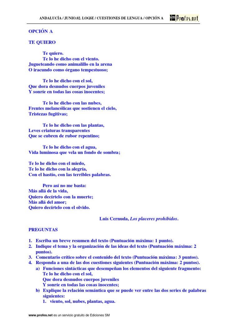 No hay palabras para lo que l siente. Estamos ante un poema de luis cernuda, poeta de la generacin del 27, titulado te quiero, que pertenece a su libro los placeres prohibidos, publicado en 1933 y que, en forma pstuma, se incorpor al libro la realidad y el deseo. Te quiero luis cernuda el poema consta de siete estrofas de las cuales, las seis primeras del poema, el autor afirma el amor en distintas circunstancias por donde ha pasado su amada. Te lo he dicho con el.