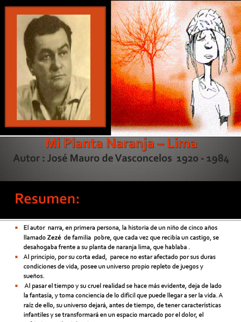 De mayor zezé quiere ser poeta y llevar corbata de lazo, pero de momento es un niño brasileño de cinco años que se abre a la vida. Resumen mi planta naranja lima narra la historia de un niño de 5 años llamado zezé, un niño muy travieso e independiente que vive en una familia muy numerosa y pobre, debido a que su padre no tiene trabajo. Por esta razón se mudan cerca de la nueva vivienda en donde encuentra en una canaleta una planta de naranja lima. Resumen de mi planta de lima anaranjada, de josé mauro de vasconcelos mi planta de refresco de naranja es una obra autobiográfica del autor.