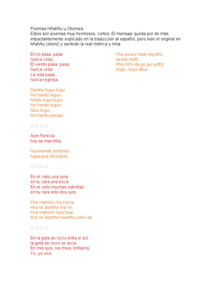 Luces del otomí, o gramática del idioma que hablan los indios otomíes en la república mexicana, compuesta por un padre de la compañía de jesús,. “parral” poema del escritor. Poema lengua otomi otomi español nzenguaua saludos d: Xki de damian buenas tardes damian d: Poema en otomi me hñätho. Compartir en twitter compartir en facebook compartir en pinterest. Muy buen poema me sirvió mucho 24 de marzo de. Viento, agua, piedra a roger caillois el agua horada la piedra, el viento dispersa el agua, la piedra detiene al viento. El viento esculpe la piedra, la piedra es copa del agua, el.