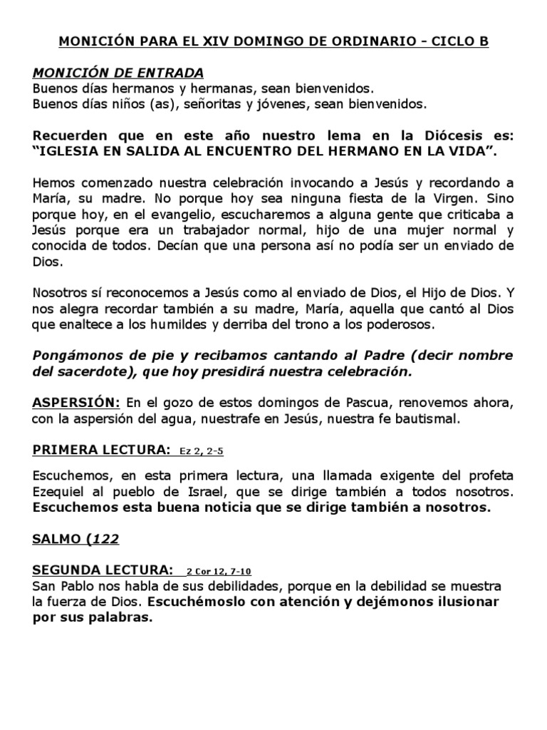 Moniciones Décimocuarto Domingo del Tiempo Ordinario – Ciclo B