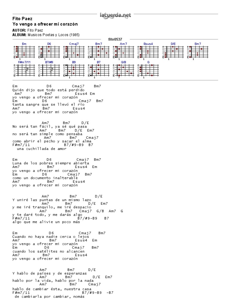 Yo vengo a ofrecer mi corazón, tanta sangre que se llevó el río, yo vengo a ofrecer mi corazón. No será tan fácil, ya sé qué pasa, no será tan simple como pensaba, como abrir el pecho y sacar el alma, una cuchillada del amor. Luna de los pobres siempre abierta, yo vengo a ofrecer mi corazón, como un documento inalterable Partituras musicais de alta qualidade de yo vengo a ofrecer mi corazón, do artista fito páez, em pdf, para baixar e imprimir.