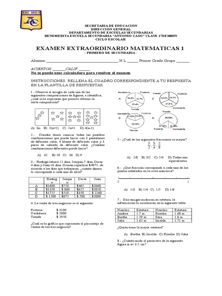Acerca de Examen Global Primero Secundaria | Educación Secundaria | Matemáticas