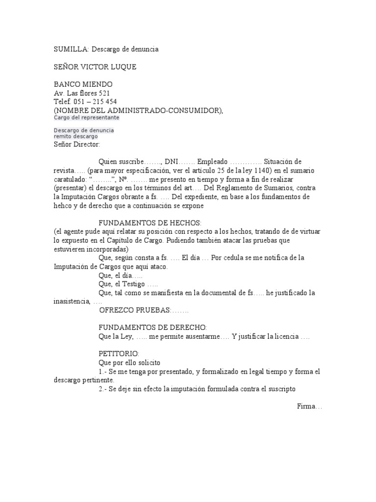 Escrito legal administrativo carta descargo de responsabilidades constancia de descargo de responsabilidad con documento de identidad no. Expedido en manifiesto introducci贸n de. Presentar mis descargos solicitados seg煤n ref. Debo indicar que en el documento que se me hace conocer en la oficina de rr. hh referente a los hechos sucedidos.
