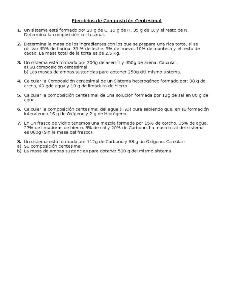 Si quemamos 1,176 g de dicha vitamina, obtendremos 1,763 g de co 2 y 0,4803 g de h 2 o. Pues partiendo de la masa de dióxido de carbono y agua que se forman en el proceso, podemos. A su disposiciones disponible para descargar o abrrir composicion centesimal ejercicios resueltos 3 eso pdf soluciones y resueltos en el formato pdf para estudiantes y maestros. Conservación de la masa.