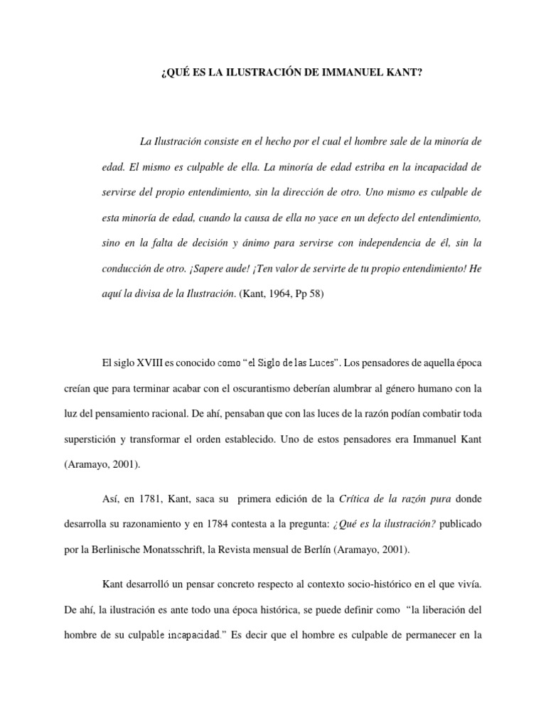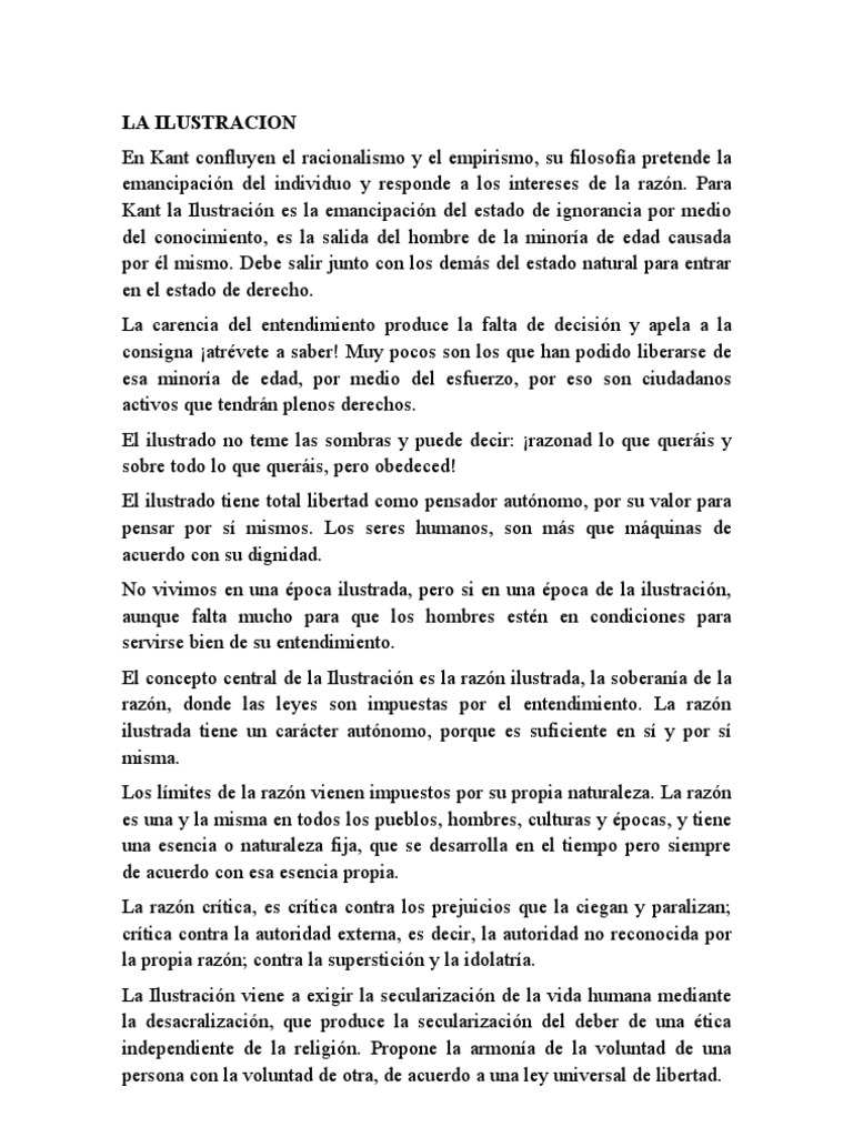Escribe que el lema de la ilustración es: “ atrévete a pensar por ti mismo ” la emancipación del ser humano por medio de la razón es el programa de la ilustración, forma parte de los ideales de la revolución francesa y es también el núcleo del proyecto filosófico de kant. El presente texto extraído de la obra de kant, respuesta a la pregunta: ¿qué es la ilustración?, hace referencia a un movimiento ideológico, propio del s. Xviii (siglo de las luces), que aspira a una transformación de la sociedad y del espíritu humano para librarle del oscurantismo y la superstición mantenidos desde siglos anteriores. Comparto un documento que puede servir de ayuda a los chicos de 2º bachillerato a la hora de entender las implicaciones del texto de kant «¿qué es la ilustración?». En él se analizan algunos fragmentos del texto, se relacionan con la teoría del autor y se muestran algunos posibles temas para que piensen y practiquen disertaciones filosóficas. En medida que se ansia responder la pregunta ¿qué es la ilustración?, la respuesta, en primera instancia y de manera sutil, radicaría en la salida del este estado de minoría de edad, en donde no se posee la decisión ni el valor para hacer uso del entendimiento y con esto actuar en la vida de manera independiente de unagente externo que piense y. A este proceso educativo es a lo que kant llama ilustración.