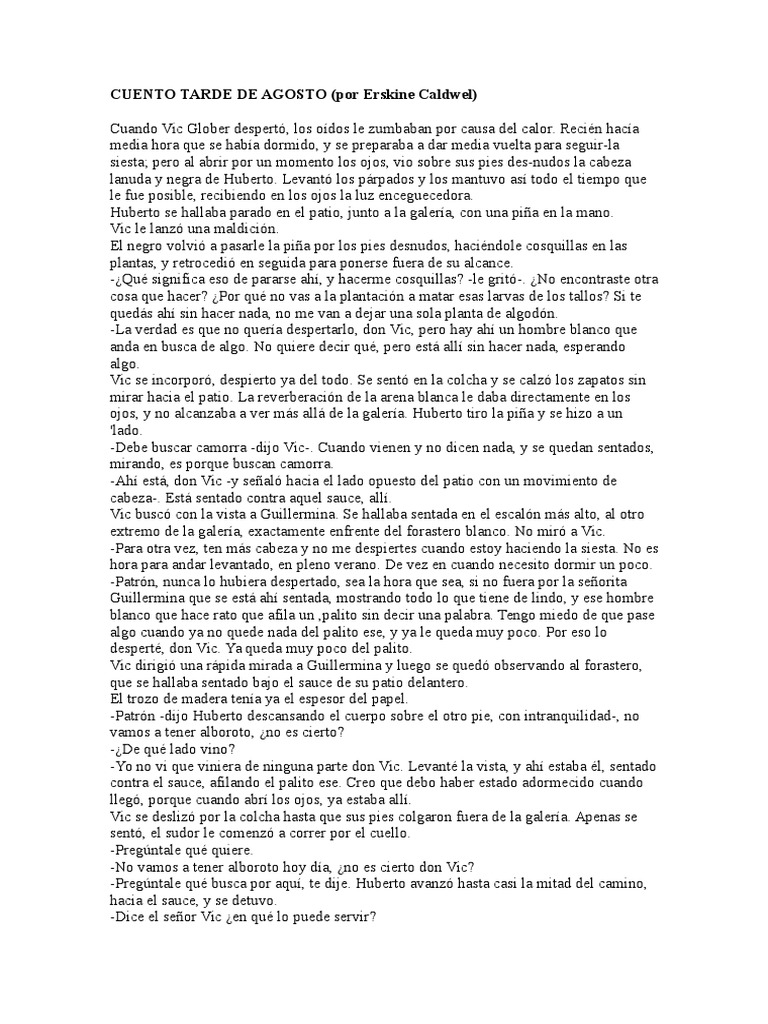 En el texto tarde de agosto, de josé emilio pacheco se presenta el concepto amor como eje central de la historia. A de lo largo de la historia podemos encontrar diferentes tipos de. Cuento tarde de agosto (por erskine caldwel) cuando vic glober despertó, los oídos le zumbaban por causa del calor. Recién hacía media hora que se había dormido, y se.