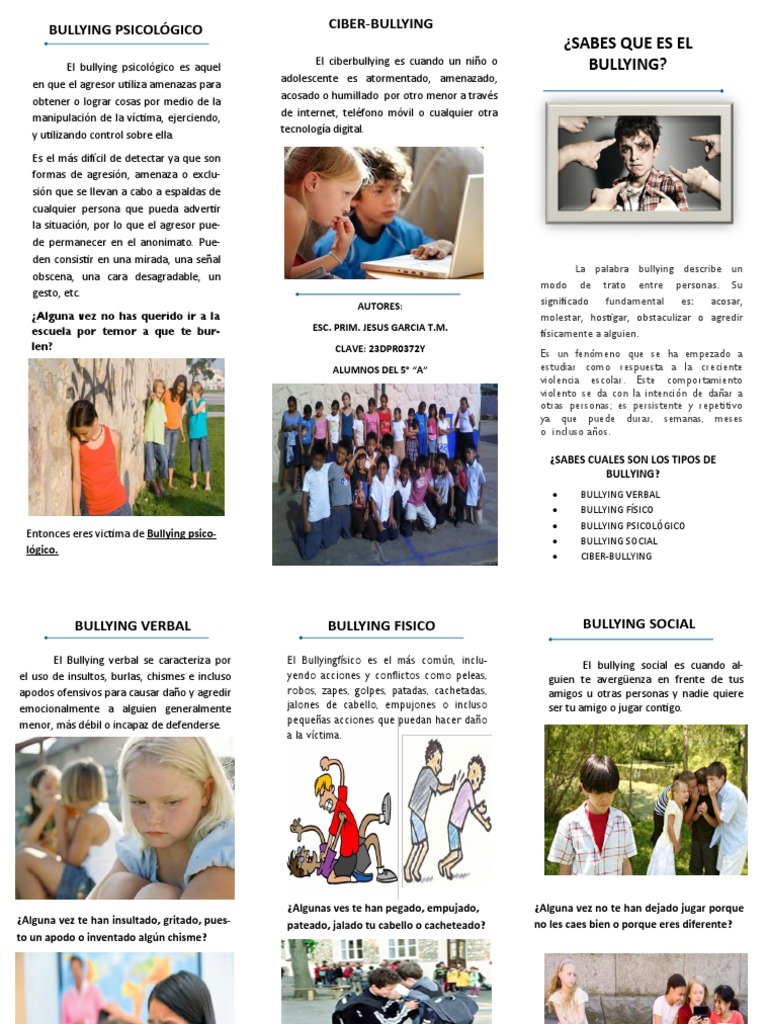 Bullying la palabra bullying proviene del inglés y en nuestro idioma significa: El bullying escolar podría. El acoso escolar (también conocido como hostigamiento escolar, matonaje escolar, matoneo escolar o por su término inglés bullying) es cualquier forma de maltrato psicológico, verbal o físico producido entre escolares de forma reiterada a lo largo de un tiempo determinado. Triptico del bullying escolar pdf triptico sobre la prevencion del bullying en la comunidad escolar.