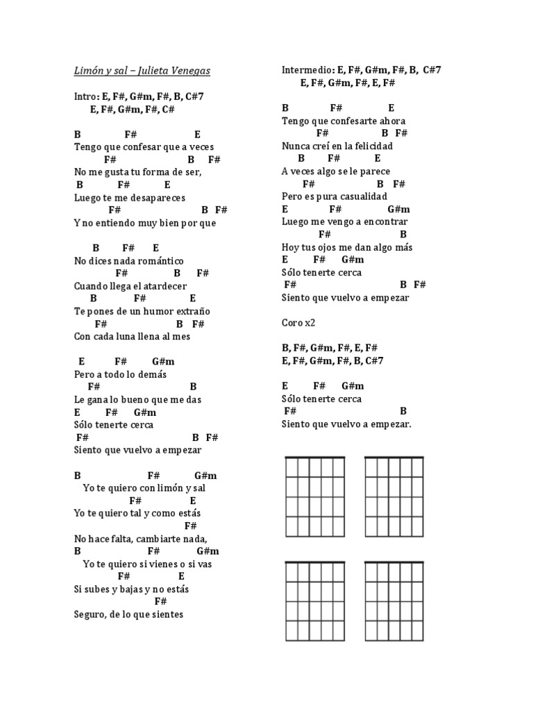 Limon y sal chords by simon grossmann. Learn to play guitar by chord / tabs using chord diagrams, transpose the key, watch video lessons and much more. E, f#, abm, f#, b, e e, f#, abm, f#, e, f# b f# e tengo que confesar que a veces f# b no me gusta tu forma de ser, b f# e luego te me desapareces f# b f# y no entiendo muy bien por que b f# e no dices nada romántico f# b cuando llega el atardecer b f# e te pones de un humor extraño f# b f# con cada luna llena al mes e f# abm pero a todo lo. Simplificada (guitarra y guitarra eléctrica) favoritar cifra.