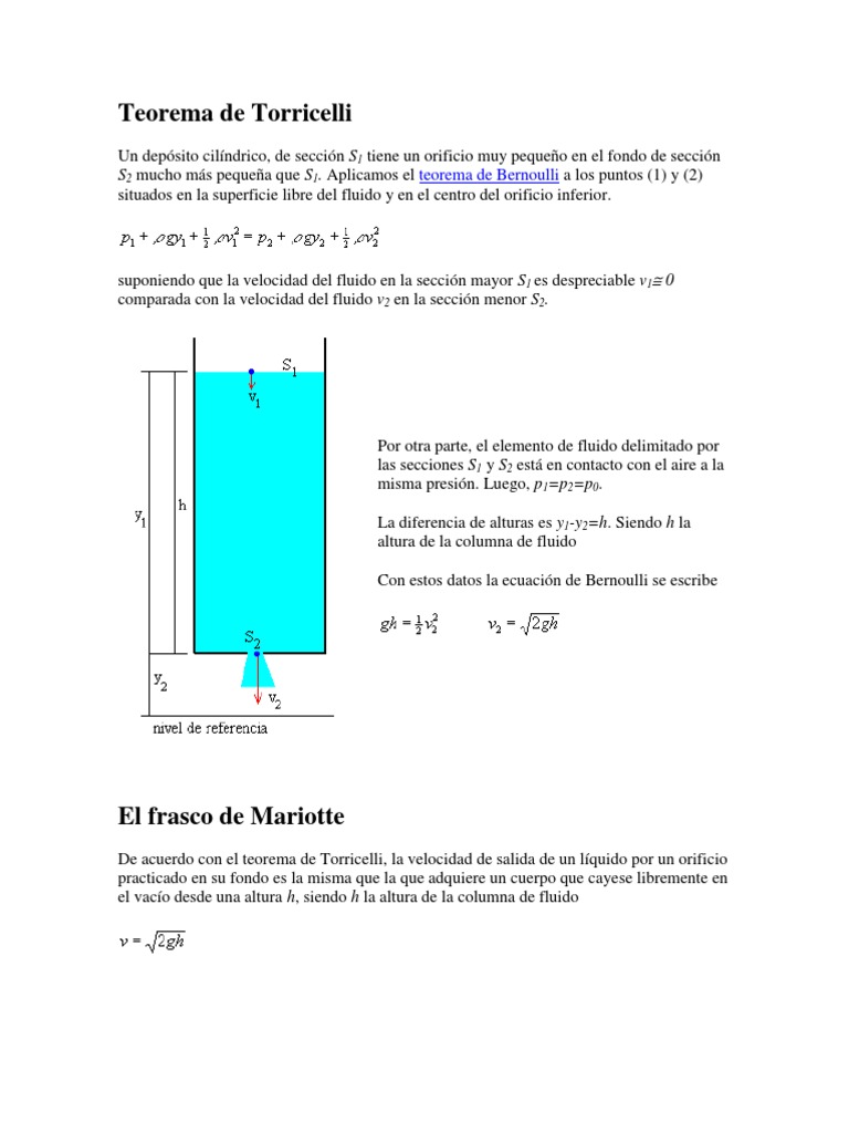 Buscar en este sitio. Teorema de torricelli > ejemplos. Sign in | recent site activity | report abuse | print page | powered by google sites. Ejercicios resueltos teorema de torricelli archives | civilgeeks. com whatsapp: Teorema de torricelli ejercicio resuelto fórmula ejercicio resuelto: ¿cuál es la velocidad del agua que circulará por ese orificio, si el tinaco tiene una. Teorema torricelli edico un recipiente cilíndrico se llena de un líquido hasta alcanzar un metro de altura con respecto a la base del recipiente. A continuación se hace un orificio en un punto situado 80 cm por debajo del nivel del líquido: A) ¿cuál es la velocidad de salida del líquido a través del orificio?