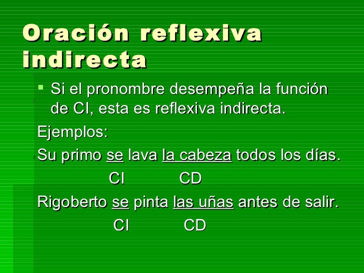 Oraciones reciprocas y oraciones reflexivas que son oraciones reciprocas y oraciones reflexivas la oraciones reflexivas: Son aquellas oraciones predicativas, activas y transitivas en las que el. Clasifica las oraciones reflexivas en directas e indirectas. Ellos se lavaron la cara en las aguas del río.
