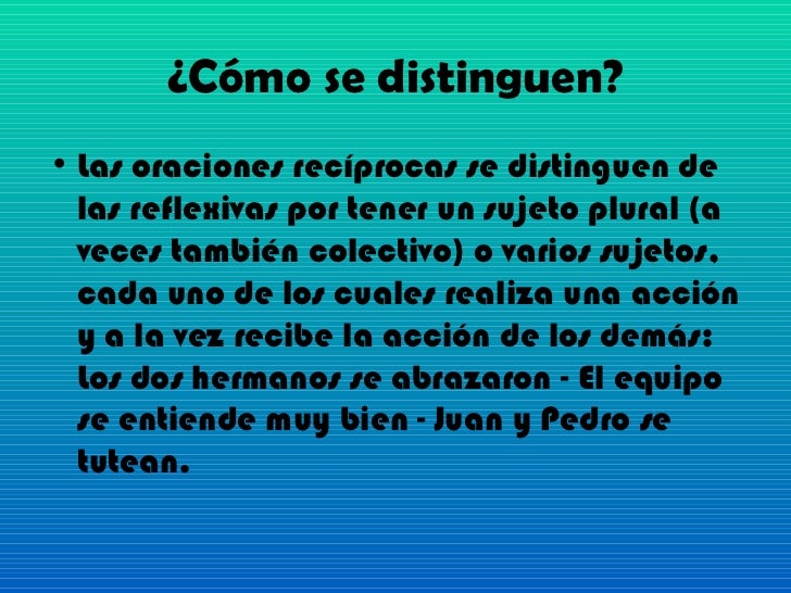 Las oraciones recíprocas son aquellas que contienen un verbo recíproco, es decir, una acción mutua que se realiza y recibe por un sujeto plural. Tú y yo nos entendemos muy. 2 las oraciones recíprocas son un tipo de refleja. Hay más de un sujeto que realiza la acción del verbo y que al tiempo la recibe. Las oraciones se construyen solo con sujetos en. Scribd es red social de lectura y publicación más importante del mundo. Abrir el menú de navegación. Cerrar sugerencias buscar buscar. Es change language cambiar idioma.