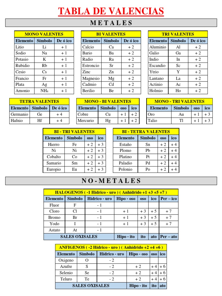 Tabla de valencias químicas metales no metales monovalentes litio li sodio na potasio k plata ag rubidio rb +1 cesio cs francio fr amonio* nh4+ divalentes berilio be magnesio mg calcio ca estroncio sr +2 bario ba radio ra. About press copyright contact us creators advertise developers terms privacy policy & safety how youtube works test new features press copyright contact us creators. Esto significa que los elementos no metálicos son elementos con puntos de ebullición relativamente bajos, que son malos conductores del calor y la electricidad y que no ceden fácilmente sus electrones. En la siguiente tabla periódica, los cuadrados de los elementos no metálicos están coloreados en rojo.