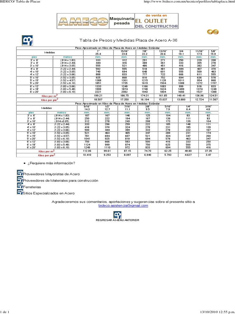 Artículos Tabla de Pesos y Medidas Placa de Acero A-36: Maquinaria pesada