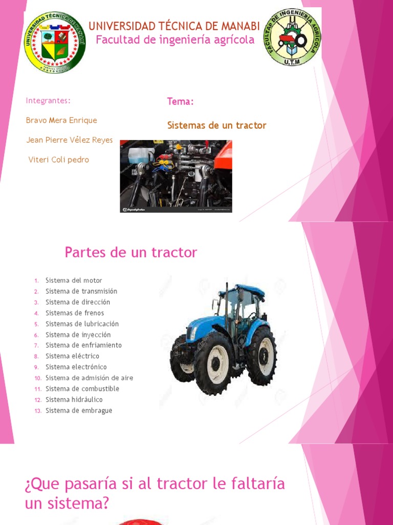 Un tractor agrícola es una máquina automotriz con capacidad para remolcar, arrastrar y accionar otras máquinas. Un vehículo automóvil con motor de mucha potencia y con grandes ruedas que se adhieren fuertemente al terreno. Características de los tractores agrícolas baja velocidad. Estructura fuerte y rígida tienen una alta capacidad de tracción. Principales partes del tractor motor. Al igual que sucede con casi todos los vehículos, este es el elemento principal de la estructura de un tractor. Su labor, en resumen, es la de transmitir fuerza y favorecer la movilidad del vehículo al generar energía mecánica. Controla la velocidad y el desplazamiento del tractor. La agricultura es otro de los ámbitos que ha ido progresando gracias a los avances de la ciencia y la técnica.