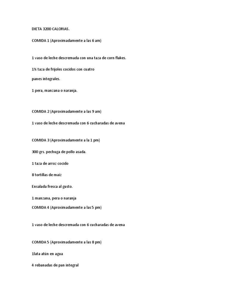 Dieta 3100 calorías jul 31, 2014 dic 9, 2021 kevin bravo dieta de 3100 calorías para volumen. 55 gramos de pan integral. 55 gramos de atún en lata. 40 gramos de almendras. Los hombres adultos requieren entre 2000 y 3000 calorías en un día. Las mujeres maduras, por otro lado, requieren entre 1600 y 2400 calorías al día. Esto se debe a que su cuerpo utiliza menos calorías en reposo cuando es mayor, en comparación con cuando era más joven. O dietary guidelines for americans recomenda uma dieta de 3. 200 calorias para apenas adultos jovens do sexo masculino que são muito ativos a cada dia. O objetivo de um plano de dieta de 3,200 calorias é fornecer ao corpo energia adicional para ajudar você executa no seu melhor.