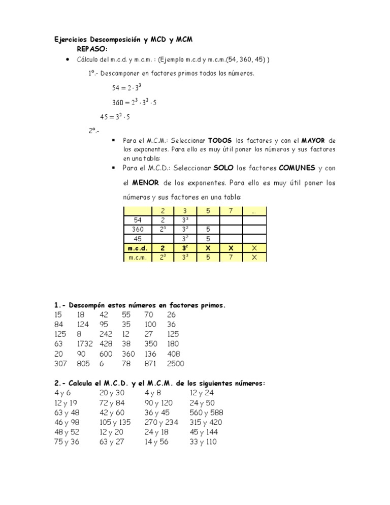 Imprescindible Ejercicios Descomposición y MCD y MCM actualizar