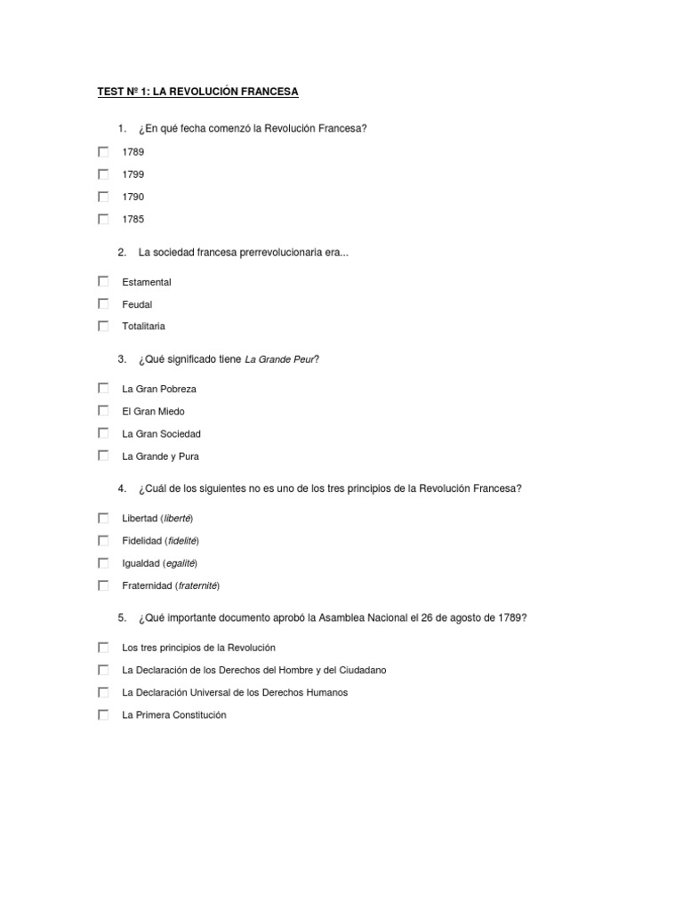 (3792) un ejercicio para conocer esta época fascinante. Test para revisar tus conocimientos sobre la revolución francesa. 21 años 30714 veces realizada creada por top 10 resultados 2 3 4 5 6 7 8 9 25 de septiembre de 2015 10 ¿quieres aparecer en el top 10 de esta actividad? Inicia sesión para identificarte. El derrocamiento de luis xvi, la abolición de la monarquía en francia y la proclamación de la i república, con lo que se pudo poner fin al antiguo régimen en este país. (1 punto cada uno, 15 puntos totales. ) 1. ___ el antiguo rgimen se caracteriza por una economa en su mayora agraria, con una monarqua absoluta y una sociedad igualitaria. 2. ___ la sociedad estamental del antiguo rgimen se divide en: Francia ¿cuanto sabes de la revolucion francesa? Test historia 28,169 views premiered dec 1, 2019 hola!