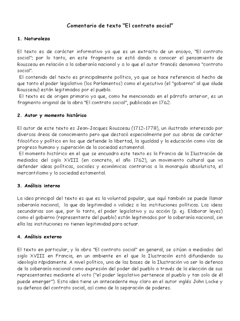El contrato social, 1762 introducción se trata de un texto de carácter filosófico pues habla de conceptos de esta índole, tales como libertad e igualdad. El autor es jean jacques rousseau, uno de los pensadores más importantes de la ilustración. Webcomentario de texto “el contrato social” 1. Naturaleza el texto es de carácter informativo ya que es un extracto de un ensayo, “el contrato social”; Por lo tanto, en este fragmento se está dando a conocer el pensamiento de rousseau en relación a la soberanía nacional y a lo que el autor francés denomina “contrato social”. Webrelación compleja “ el hombre ha nacido libre y por doquiera está encadenado” principio humano somos libres por naturaleza anhelo de libertad autodeterminación libertad moral , libertad interna incompatibilidad ente ser libre y obedecer las leyes mujeres excluidas de lo público , tienen que centrar a los hombres impulso sexual. Si se investiga en qu consiste el bien ms grande de todos, el que debe ser la meta de todo sistemalegislativo, veremos que consiste en dos cosas principales: La libertad y la igualdad. Web“lo que hace la constitución de un estado verdaderamente sólida y duradera es que la conveniencia sea totalmente observada, que las relaciones naturales y las leyes coincidan en los mismos puntos y que éstas no hagan, por decirlo así, sino asegurar, acompañar, rectificar a las otras. ” (rousseau, j.