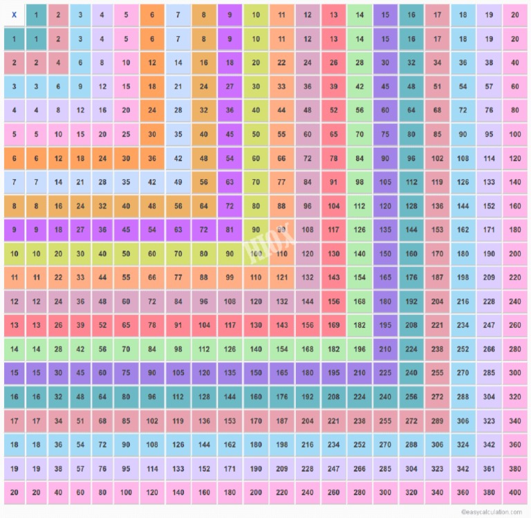 Tablas de multiplicar de 20 x 20 actualizado