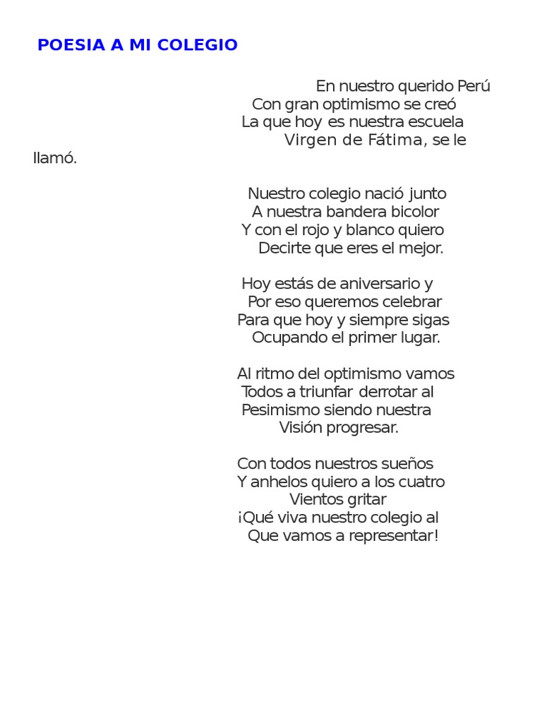 Vivian dona tere y la florina! Vieja calle de mi barrio donde anduve tantas veces, te ha dañado el paso diario de los años y los meses, tu que has visto mis amores sus entradas y salidas, y has vivido los dolores de todas sus despedidas, hoy te escribo este poema mirándote tiernamente, viendo como el sol te quema viendo el paso de la gente, vieja calle ya dañada Sentimiento y amor a mi patria Adiós, barrio querido (poema) mientras la tarde de otoño va cayendo miro mi melancólica esquina, y dentro de mi pecho, una espina muy adentro se va clavando. Cuántas arrugas en mi frente, la nieve de los años blanqueó mi testa, mi cansado caminar, ya se apresta a tomar un rumbo diferente, mientras el rocío de la tarde, moja mi semblante. Poema dedicado por la alumna del 2 do grado a nuestro querido perú Calles empedradas y jardines bien cuidados, árboles frondosos que en verano hacen sombra. . gatos perezosos que duermen todo el día, perros revoltosos que juegan en la vía. . grandes amigos, con quienes compartimos, risas juegos y una que otra pelea pasajera.