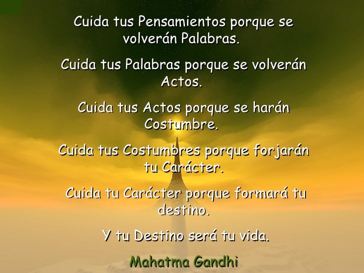 Sentimientos pensamientos palabras 70. 000 pensamientos al día cuida tus pensamientos porque se convertirán en palabras cuida tus palabras porque se. Cuida tus pensamientos, porque se convertirán en tus. Frases y citas célebres de mahatma gandhi cuida tus pensamientos, porque se convertirán en tus palabras. Cuida tus palabras, porque se convertirán en tus actos.
