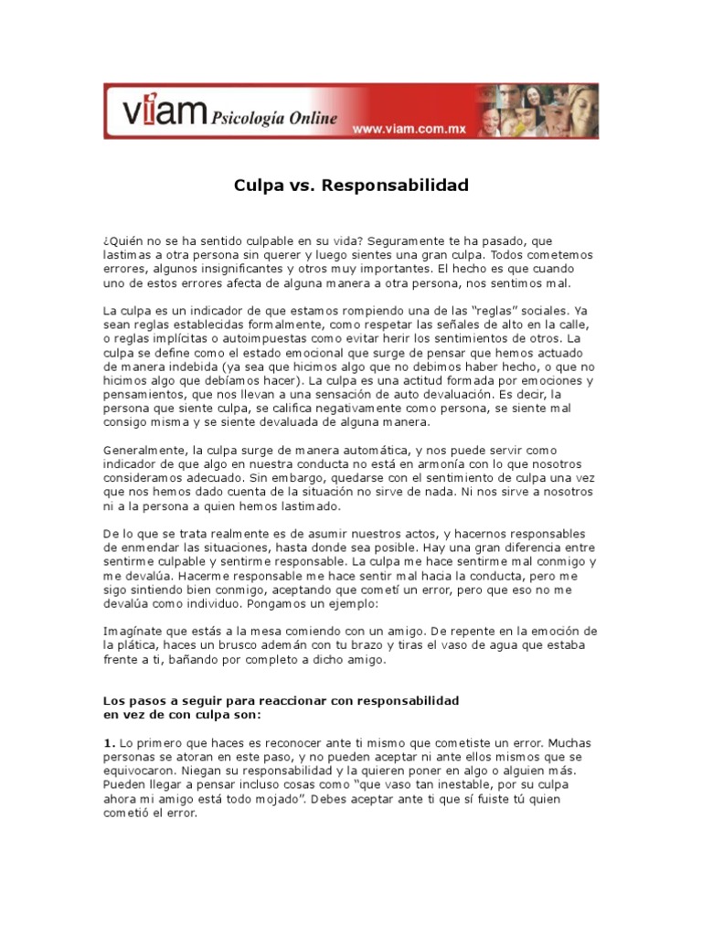 Culpa y responsabilidad 27 de julio de 2009 publicado por malena la culpa es la voz de la conciencia del si mismo que intenta recobrar el equilibrio perdido. Pero la culpa no existe, ni tampoco sirve para nada, sólo no nos deja disfrutar del momento presenta y nos ata al pasado que es imposible recobrar. Cuando el daño es solamente imaginario, la responsabilidad estriba en hacer conscientes esos sentimientos de culpa, estableciendo su origen y la forma en que se manifiestan. Atormentarte por una culpa, no te hace mejor.