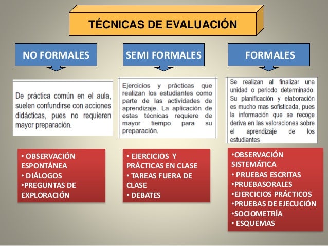 Conclusión en pocas palabras, este artículo detalla la principal diferencia entre los dos términos de evaluación formal y evaluación informal. La forma de evaluación formal puede ser preguntas cortas o preguntas de opción múltiple, mientras que el modo de evaluación en un proceso informal es a través de muestras, informes o experimentos. Advertisement conclusion in a en pocas palabras, este artículo detalla la principal diferencia entre los dos términos de evaluación formal e informal. 2. 1. 3. 4. Evaluación formal e informal. La evaluación que el maestro aplique sin duda se traducirá en decisiones sobre el ámbito a estudiar, y para esto se distinguen dos tipos de evaluaciones: La formal o sistemática y la informal o sistemática. La evaluación informal es la que se vive en la vida cotidiana, es improvisada, con valides y Las evaluaciones informales son herramientas más informales basadas en la observación.