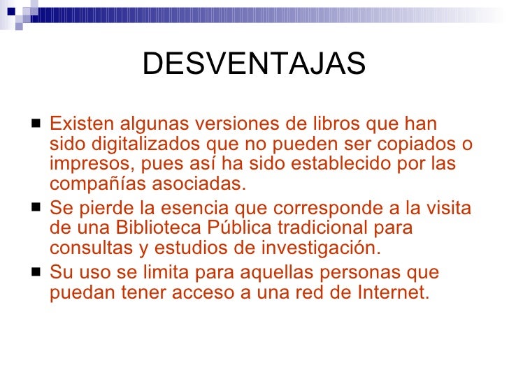 Mayor acceso a informacion. Sin embargo como casi todas las cosas su uso tiene ventajas y desventajas. Entre las principales ventajas estn: Mediante una biblioteca virtual podemos acceder a un sinnmero de informacin sobre el tema que queremos consultar incluso podemos consultar varios documentos al mismo tiempo y poder comparar y sacar la informacin ms importante. •la piratería se hace presente y, con ello, que los autores carezcan de los beneficios que, por derecho, les corresponden. •falta de recursos económicos en los hogares ya que no toda la gente cuenta con los medios para tener acceso a una computadora o internet. (morales, 2011) bibliografía dante, p. Ventajas de las bibliotecas virtuales ahorro de papel. · disminución de la necesidad de espacios en las bibliotecas. · crecimiento y mejor organización de los acervos. · optimización de los mecanismos de búsqueda de textos, imágenes,vídeos y audio. · facultad de acceder a información desde cualquier parte del mundo e, igualmente, compartirla. Las bibliotecas virtuales solamente funcionan con conexión a internet.