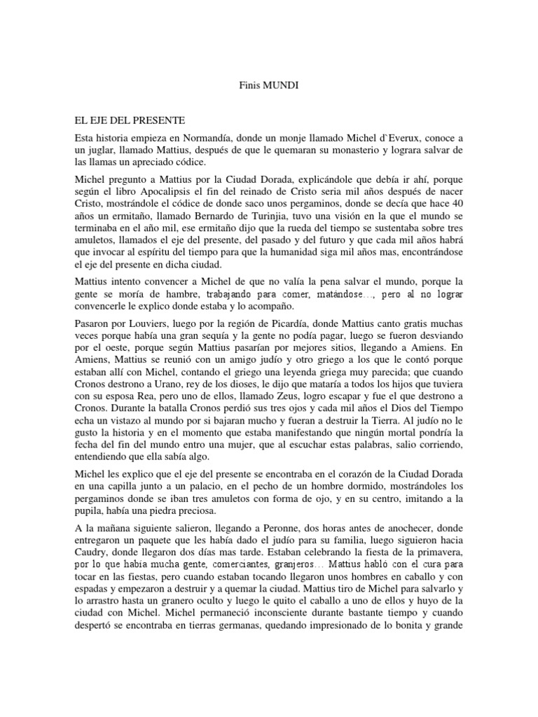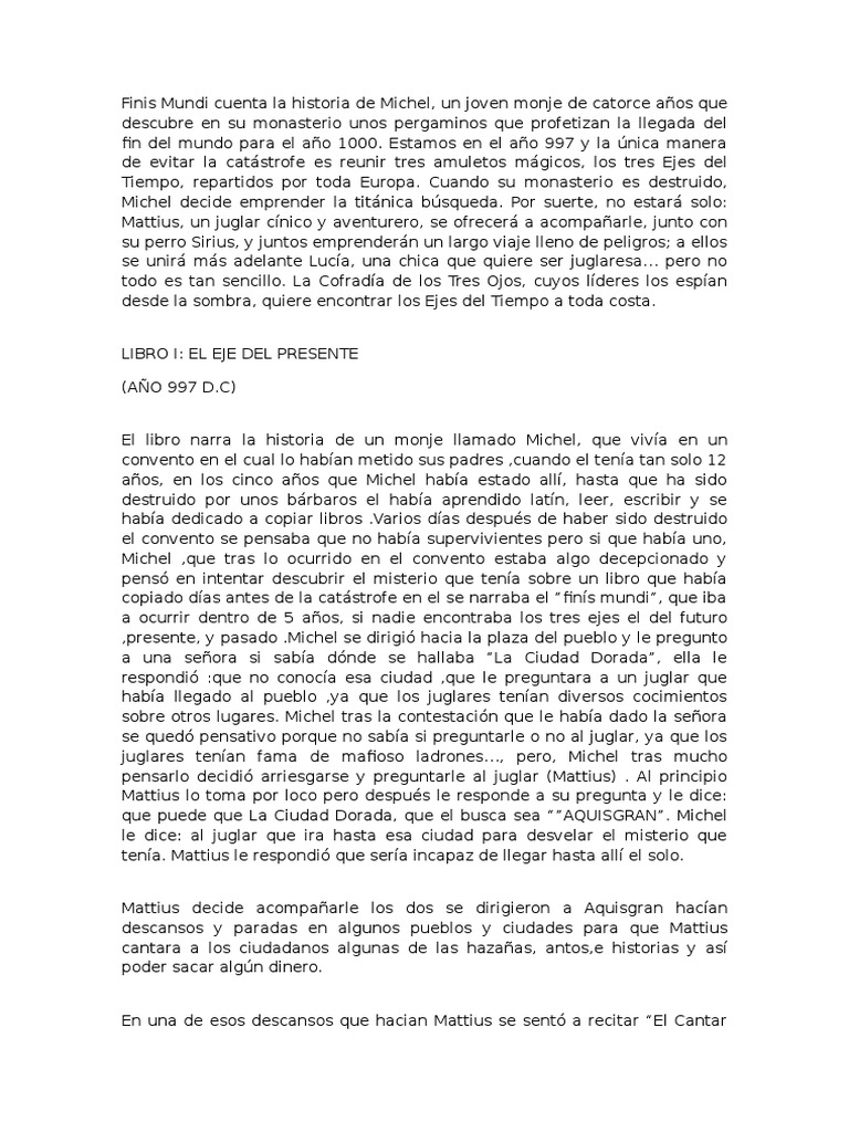 Resumen de finis mundi introducción nos situamos en francia, en el año 997. Unos pergaminos revelan que michel, un joven monje cluniacense, que el mundo se acabará en el año 1000 a no ser que se invoque al espíritu del tiempo y se le dé una razón para que le conceda a la humanidad otros mil años. Es un juglar que encontró a michel en normàndia. Es un monje de cluny muy delgado y alto.