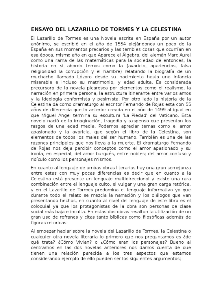 Ensayo Del Lazarillo de Tormes y La Celestina | PDF | Novelas más