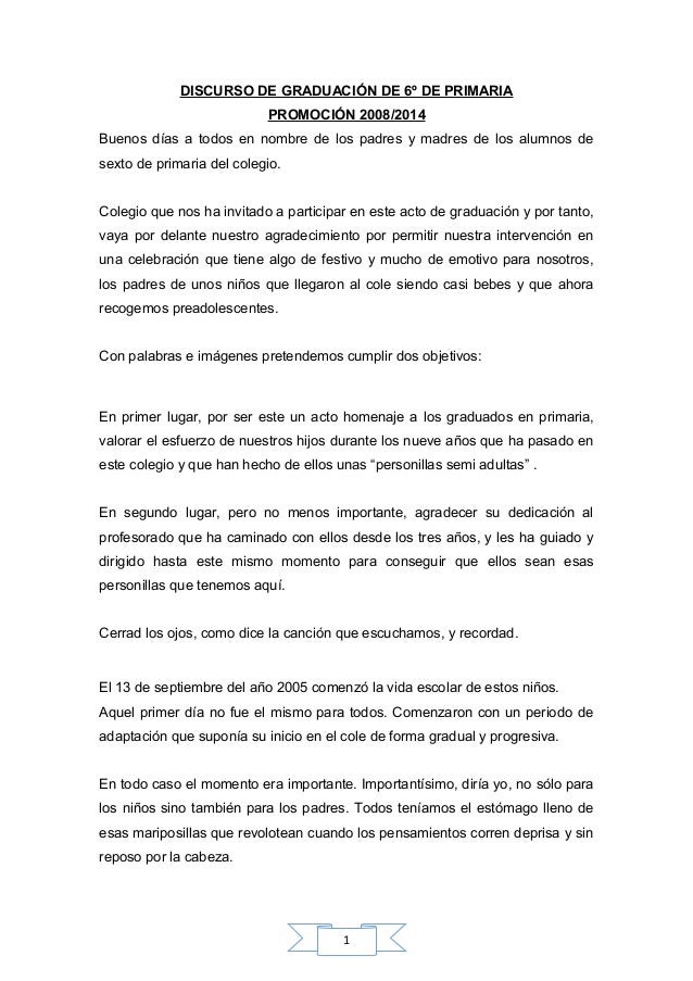 Webdiscurso de graduación de primaria el momento donde los más pequeños empiezan a crecer es ¡genial!, por lo que se puede hacer un discurso de graduación corto. Ponemos a tu disposición el discurso completo para que lo descargues en el siguiente enlace segunda opción de discurso de graduación para educación primaria Webdiscurso graduación 6º primaria curso cuando me propuse hacer la despedida, pensé, voy a hacer un discurso a la americana: Un chiste al principio, otro al final y nada en medio.