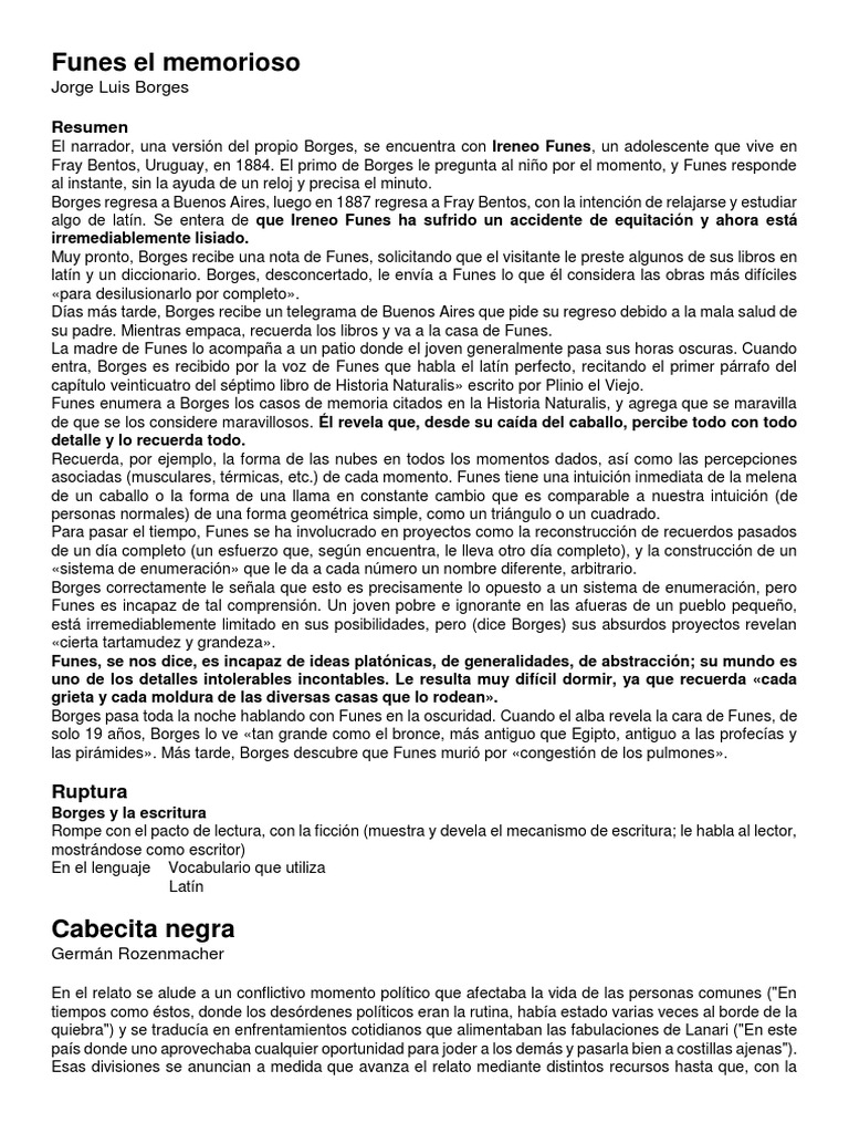Análisis de funes el memorioso de jorge luis borges. “ funes, detrás del personaje” funes el memorioso es uno de los cuentos de ficciones, el libro que el escritor jorge luis borges. Funes era capaz de percibir toda la información posible a detalle y almacenarla completamente, características propias de un genio mas no un completo sabio pues a falta de cierta. Funes el memorioso es un cuento del escritor argentino jorge luis borges. Apareció en ficciones, una colección de cuentos y relatos del autor publicada en 1944. Analisis de funes el memorioso resumen 1. Funes el memorioso de borges frente a un joven muy blanco de guimaráes rosa* petrona d. De rodríguez pasques, universidad de buenos. El relato “funes, el memorioso” fue analizado por el neurocientífico argentino rodrigo quain quiroga, quien lo comparó con los resultados de sus propios estudios.