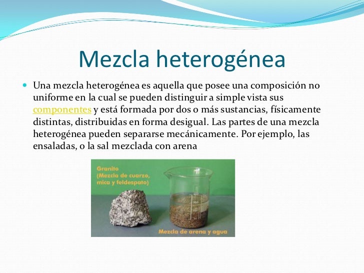 Submit your answer latest questions in química El agua de mar es una mezcla homogénea de agua, sal de mesa y una variedad de otros compuestos, acero inoxidable es una mezcla homogénea de hierro, carbono, níquel y otros elementos. El hierro es un elemento metálico duro, cuya temperatura de fusión es de entorno a 1. 535 ºc, y el punto de ebullición es de unos 2. 740 ºc. Una mezcla heterogénea es una mezcla con una composición no uniforme. La composición varía de una región a otra con al menos dos fases que permanecen separadas entre sí, con propiedades claramente identificables. Si se examina una muestra de una mezcla heterogénea, se pueden ver los componentes separados. La madera es una mezcla de tipo homogénea, ya que está conformada por distintos componentes que no se pueden distinguir a simple vista. Una mezcla es la combinación o unión física de dos o más sustancias en donde las propiedades químicas no cambian debido a que las sustancias no interaccionan químicamente entre sí. La madera, el granito, las rocas, arena y agua, aceite, la sopa de verduras, las ensaladas son ejemplos de mezclas heterogéneas.