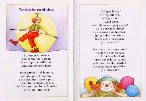 En el árbol de mi pecho hay un pájaro encarnado. Cuando te veo se asusta, ¡eres un espantapájaros! A veces quiero preguntarte cosas. A veces quiero preguntarte cosas, y me intimidas tú con la mirada, Da vueltas alrededor del sol con su cadena de hombres. Desde que hemos nacido viajamos a ciento doce mil kilómetros por hora. La tierra no se para y sigue dando vueltas, por eso hay tanto viento, por eso siempre hay olas, por eso envejecemos tan deprisa, por eso estamos locos, porque toda la vida haciendo un viaje sin llegada Soy la araña 1 de españa 2 que ni pica 3 ni araña, 4 bailo flamenco 5 en la pestaña. 6 bailo con todas mis patas.