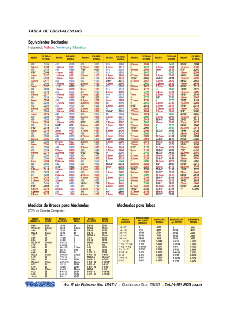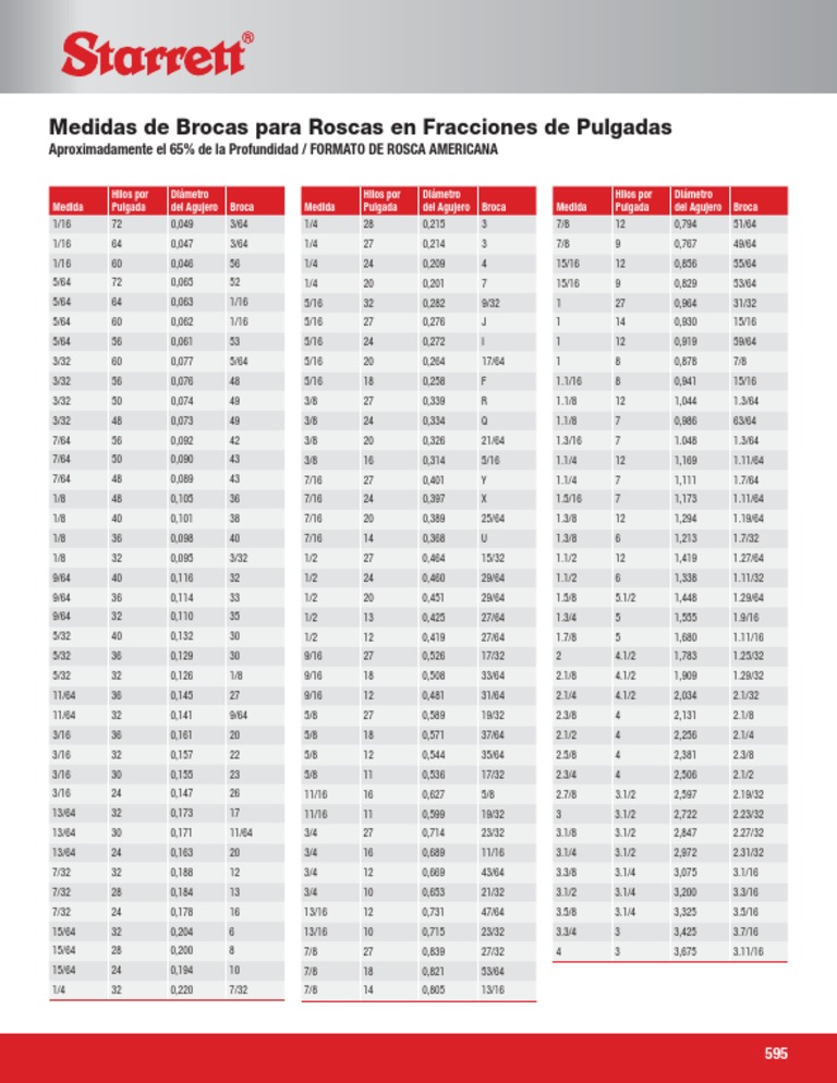 Porcentajes cuando se usa con el numero “h˝ o “d˝ recomendados. Los números “h˝ o “d˝ más grandes,. Webtablas de brocas, roscas, materiales, velocidades. Estimados amigos, he preparado una recopilación de tablas con interesantes datos para que. Webtabla para roscas npt, diámetros básicos en este post quiero compartirles una tabla con las dimensiones básicas de las roscas npt, en ella encontrarán el diámetro exterior, el. Webtabla de revoluciones por minuto (r. p. m. ) segun broca y velocidad de corte (vc) vdad. Corte broca y revoluciones por minuto m/min. 2,50 6,50 477 382.