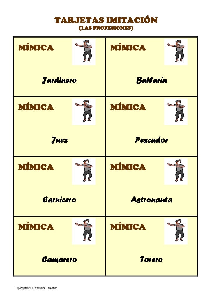 Representar la palabra, frase o el concepto. Al terminar el tiempo (o antes, si logran adivinar), pasa uno del otro equipo y se repite el proceso. Escriba las frases o palabras para. Esta lista contiene un montón de palabras que son incómodas y divertidas de actuar. 4 juegos de mímica para adultos. Los animales son palabras graciosas y difíciles para actuar. Finge que eres un animal · 4. Escribe palabras o frases en papelitos y ponlos en una gorra o caja pequeña. Un ejemplo, puede ser una cámara de fotografías, un teléfono móvil, un.