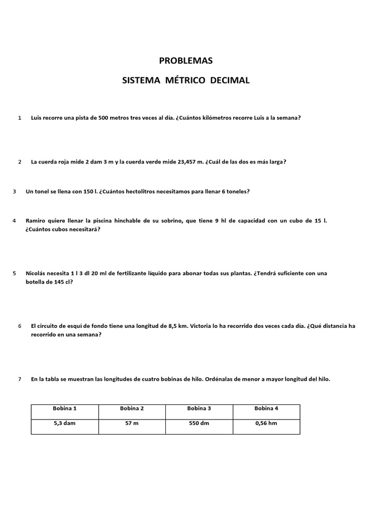 Asunto Ejercicio de Problemas Sistema Métrico Decimal Ficha 2 popular