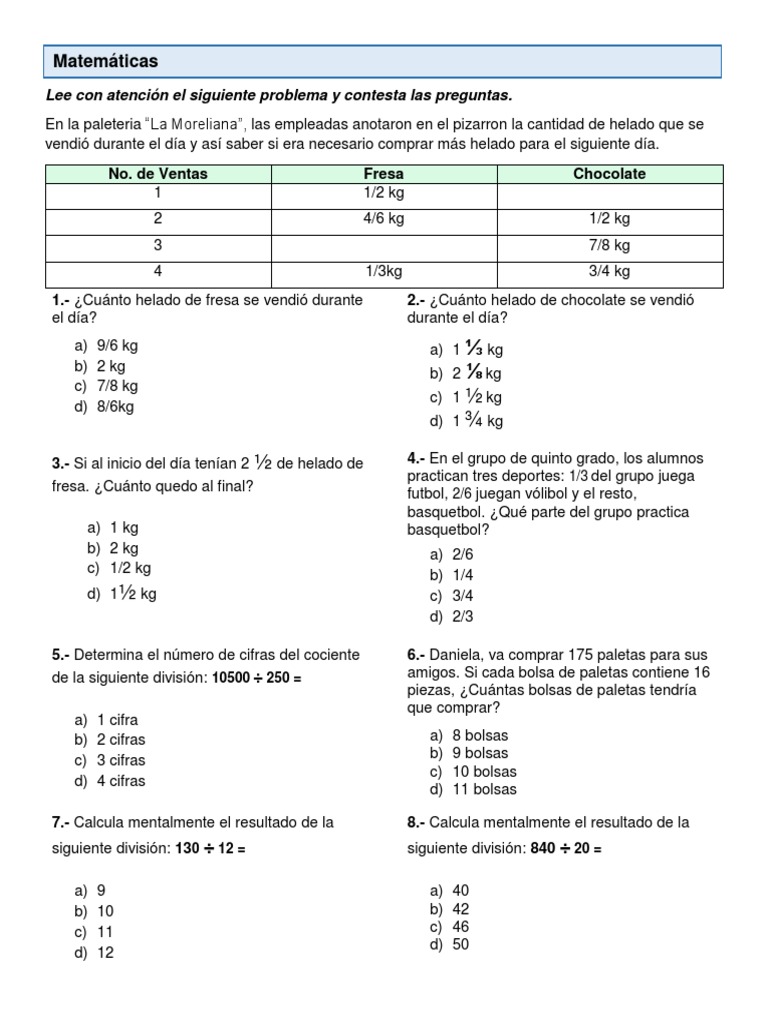 Noticias Preguntas de Examen MATEMATICAS – 5to Grado Primaria Bloque 1