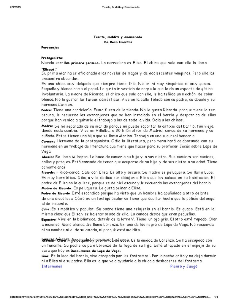 Acción explica el punto de partida de la acción. ¿qué hech o precipita los hechos que desarrolla la novela? La novela presenta aspectos sobrenaturales, que pod rían servir para clasificarla como fantástica. ¿por qué los libros de lope de vega no se encuentra n en el lugar apropiado en la biblioteca? Trabaja la estructura interna de la obra: Planteamiento, nudo y desenlace. Más tarde, cuando tengas claro dónde empieza y acaba cada uno, dedícale unas líneas, de forma individualizada a los tres apartados. A continuacion aqui hemos dejado para descargar tuerto maldito y enamorado examen. Copiar en un examen.