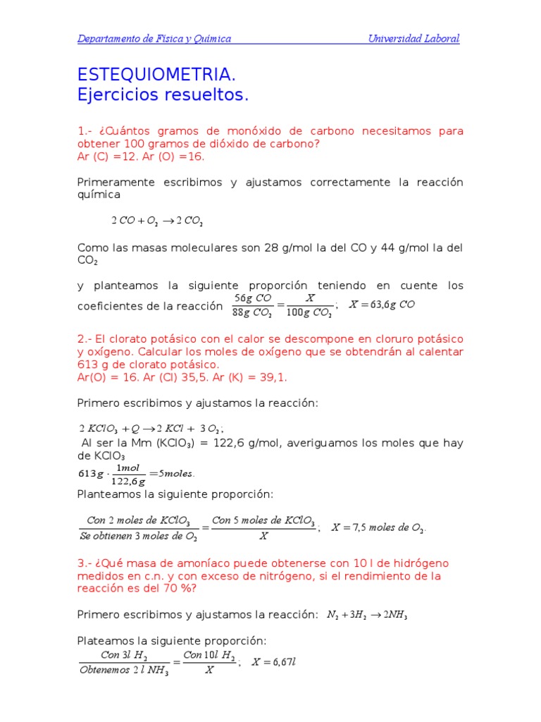ESTEQUIOMETRIA Y CALCULOS ESTEQUIOMETRICOS MOL EJERCICIOS RESUELTOS DE