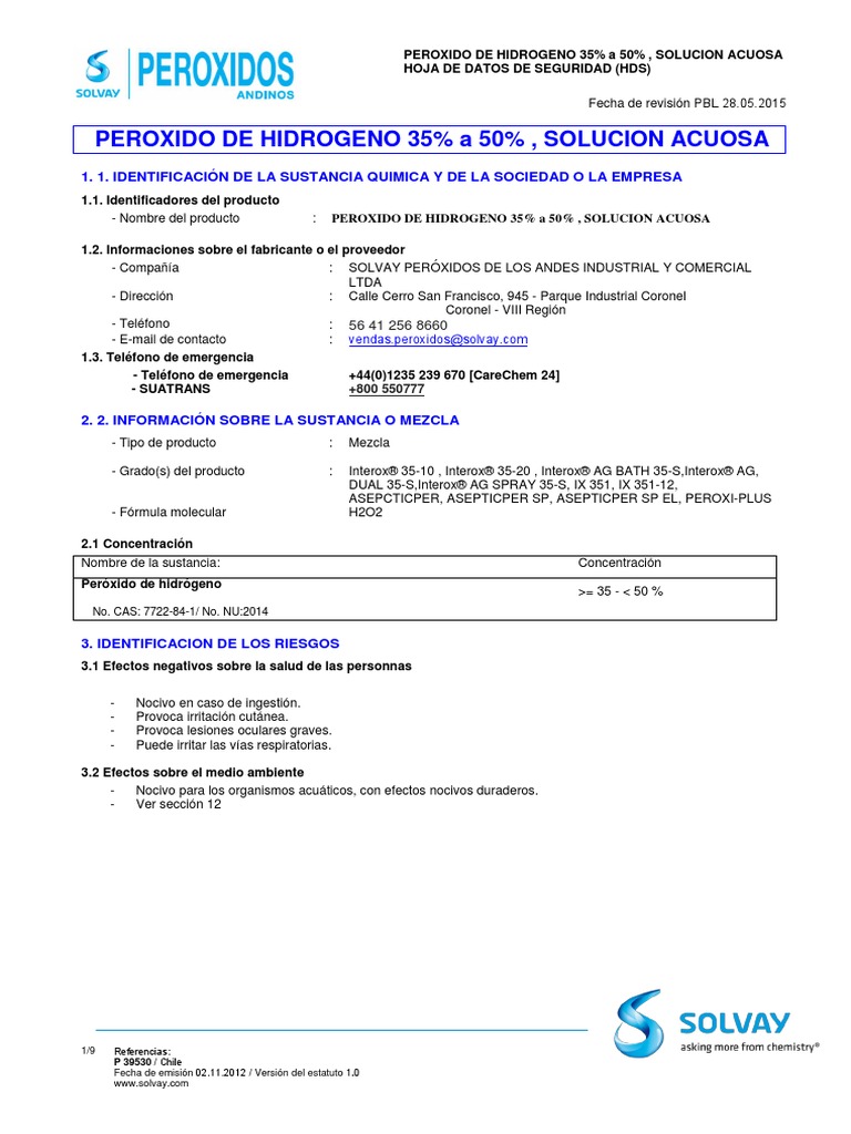 Generalmente se comportan como sustancias oxidantes. 3 en contacto con material combustible pueden provocar incendios o incluso explosiones. La fórmula que se utiliza de forma general para representar a los peróxidos es a 2 (o 2) n, en donde a representa al elemento metálico y la n representa el número de oxidación. es importante mencionar que esta formula no puede ser simplificada al máximo, esto porque en ella siempre deberá de estar presente un número par de átomos que corresponden al oxígeno. Venta de productos químicos para materia primas: