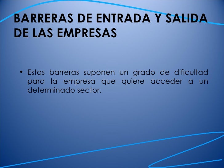 Las barreras de salida ¿qué son? Las barreras de salida son obstáculos que imposibilitan o dificultan a una empresa la salida de un mercado, ya que obliga. Las barreras de salida son los obstáculos o inconvenientes que tiene una empresa que desea salirse de un mercado para poder hacer esta salida. Las barreras de salida son obstáculos que detienen o impiden la salida de una empresa de un mercado específico. Están asociadas con las empresas que incurren en algún tipo de pérdidas,. Las barreras de salida dificultan que abandonemos un proyecto o negocio cuando éste deja de ser interesante o rentable para el operador. Las barreras de salida restan flexibilidad al. A esto se le conoce como barreras de salida. Cabe resaltar que las barreras de entrada se relacionan a dos factores importantes a estudiar en una industria: