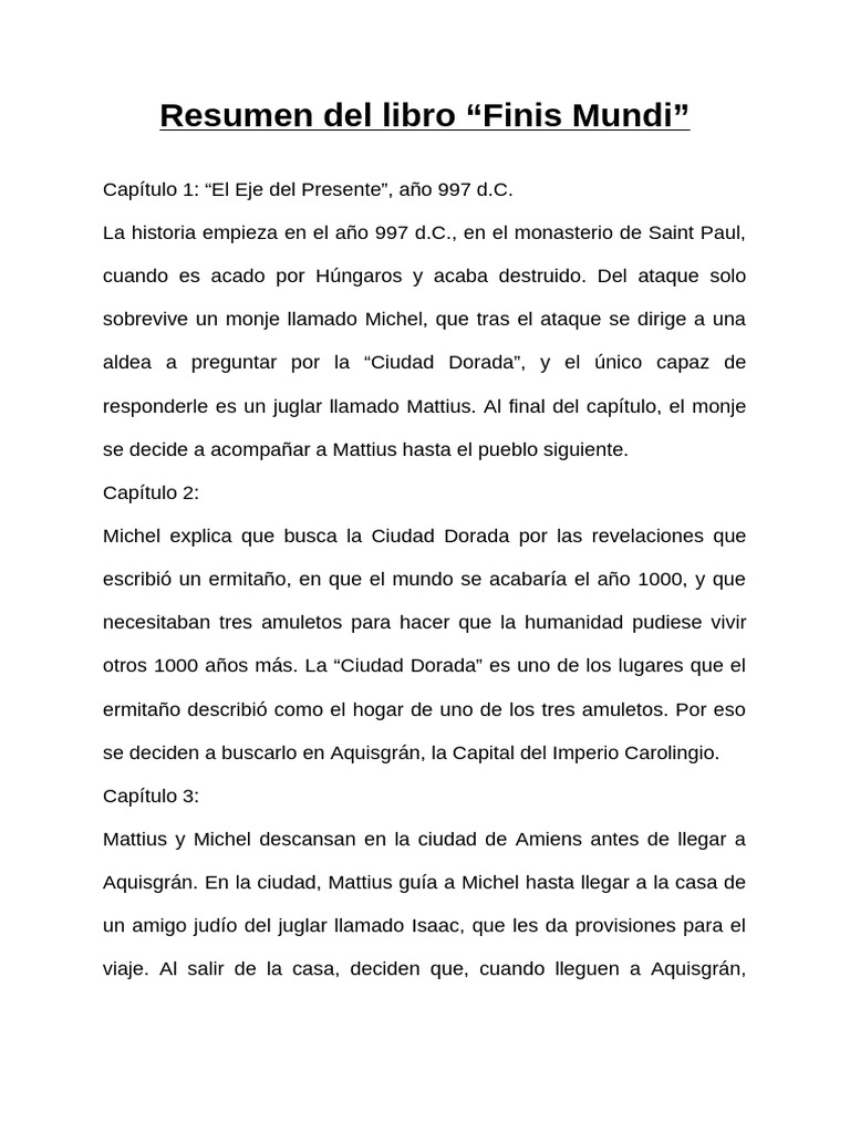 Mattius pensó que seria en finisterre en santiago de compostela. Resumen de finis mundi introducción. Nos situamos en francia, en el año 997. Unos pergaminos revelan que michel, un joven monje cluniacense, que el planeta se acabará en el. El juglar intrigado por la profecía del fin del mundo de bernardo de turingia que contiene el códice se decide a ayudar al monje diciéndole que será la ciudad de aquisgrán y. Resumen de finis mundi en esta historia los individuos tienen que batallar a la cofradía de los ejes, quienes son una secta avocan por la llegada del anticristo. Resumen finis mundi resumen general del libro la historia transcurre en francia en el año 997 d. c. Se trata de un joven monje cluniacense llamado míchel que tiene que. Resumen finis mundi cuenta la historia de michel, un joven monje de catorce años que descubre en su monasterio unos pergaminos que profetizan la llegada del fin del mundo para el año.